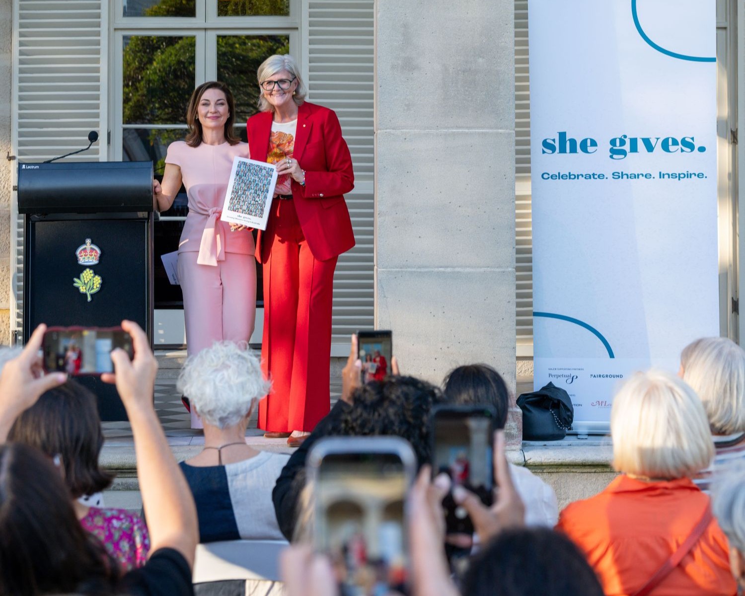 The Governor-General was launching She Gives: Growing Women’s Giving in Australia, alongside She Gives founder Melissa Smith. The lawn was filled with women from every sector and every corner of the country – women who give their time, money and skills to strengthen our communities.